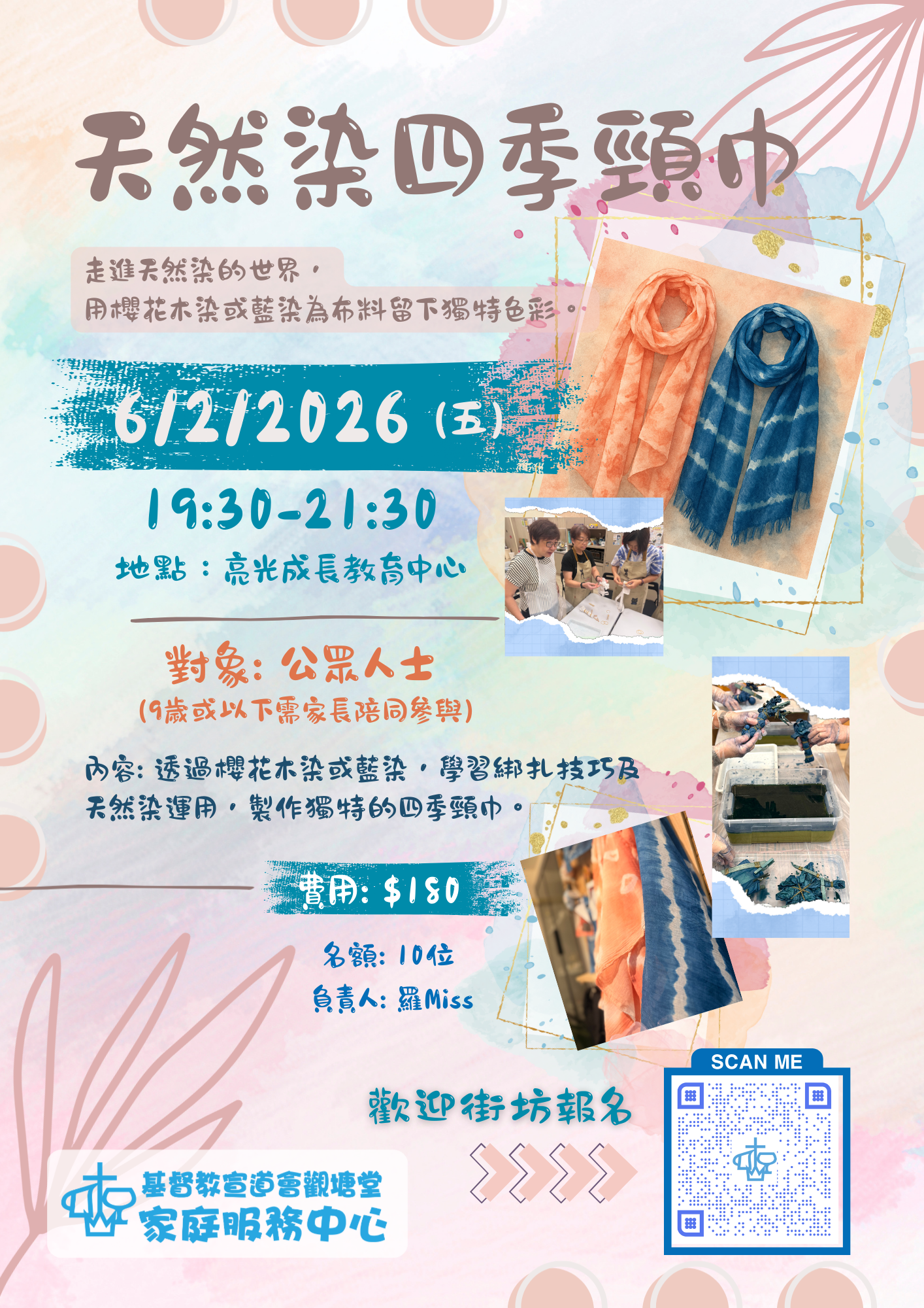 透過櫻花木染或藍染,學習綁扎技巧及天然染運用,製作獨特的四季頸巾。