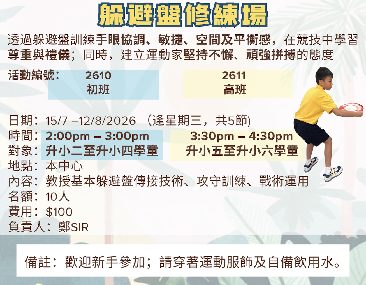 教授基本躲避盤傳接技術、攻守訓練、戰術運用